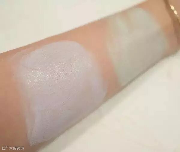 右脸是紫色,对于脸部来说,去黄气太有用了!而且不干,用后好一阵你即使不用粉底等等脸也是润润的。