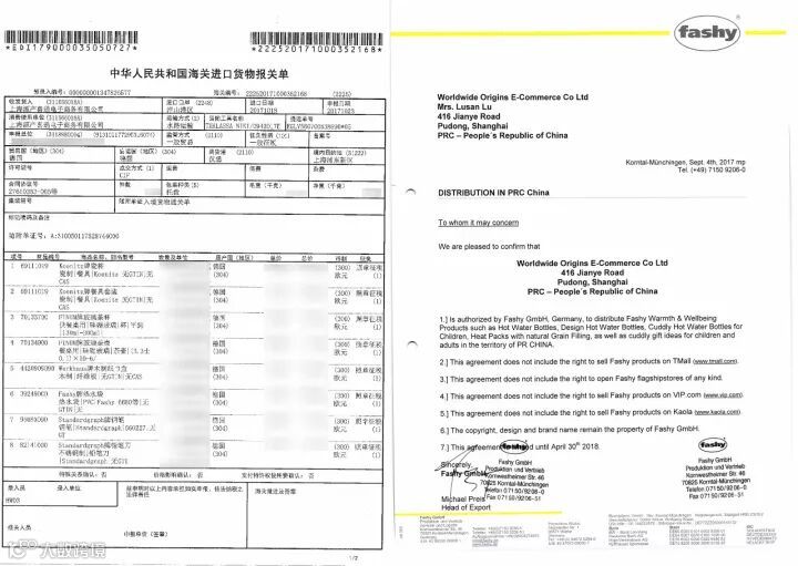 和fashy公司的合作我们是直接从工厂直接拿货运到国内仓库,保证德国原装进口,一手货源。完整的报关单和授权书如下: