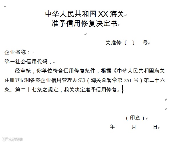 企业提交的申请材料齐全且填写完整、规范的,海关接受企业信用修复申请,并出具《信用修复申请回执》。