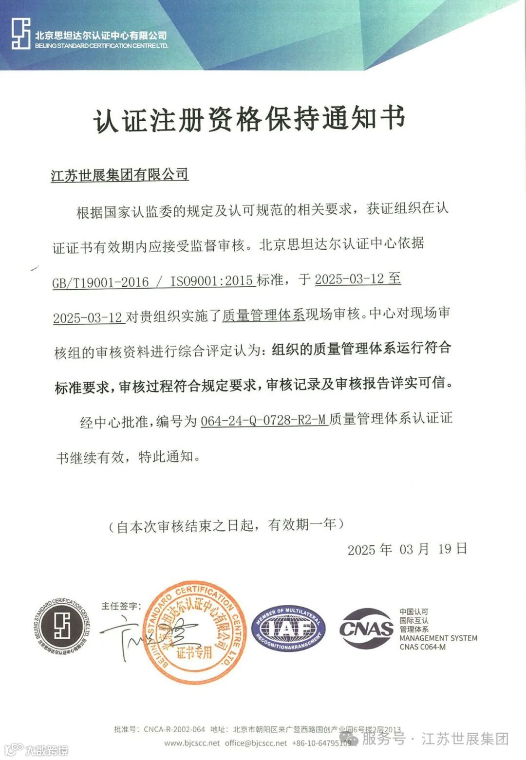 在公司全体成员的共同努力以及贵方的严谨审核下,我司顺利通过了此次ISO9001质量管理体系的外部监督审核,证书持续有效。在此,我们怀着无比感激的心情,向各位审核老师致以最诚挚的谢意!在审核期间,各位老师不辞辛劳,以专业、严谨、负责的态度,对我司质量管理体系的各个环节进行了全面、细致的审查。从文件记录的查阅,到实际操作流程的现场观察,再到与各部门员工的深入交流,每一个步骤都彰显了老师们深厚的专业素养和高度的敬业精神。