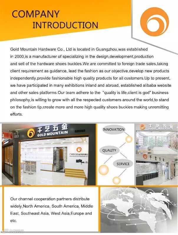 广州市千艺五金饰品有限公司,成立于2000年,是一家集设计、开发、生产和销售于一体的五金鞋扣厂家。我们公司致力于外贸销售,以客户需求为导向,以引领时尚潮流为目标,自主开发新产品,为广大的海内外客户提供时尚、优质的产品。截至目前,我们参与了国内外多个展会,建立了阿里巴巴网站等销售平台。我们坚持“质量是生命,客户是上帝”的经营理念,愿与世界各地的客户共同成长,走在时尚的前端,为创造越来越多的高品质鞋扣而不懈努力。