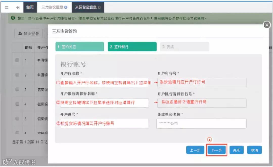 此处“开户账号”的商业银行与步骤1选择的开户行同属一家即可,开设账号的所在地区,可以与当前签约的关区不同)。