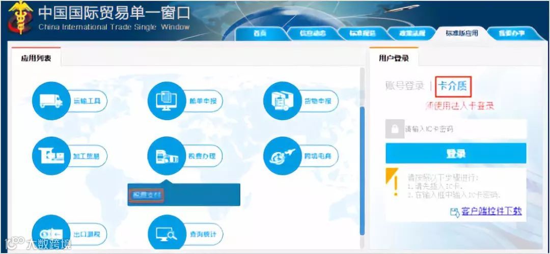 必须使用电子口岸卡介质登录单一窗口标准版,才能使用【税费支付】系统
