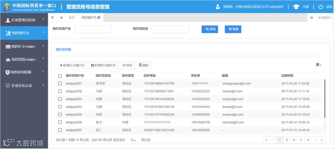 ▶登录系统,进入管理员账号信息管理界面(这一步操作,可参见上文“绑卡”部分的内容)点击“我的操作员”,右侧界面展示操作员列表。
