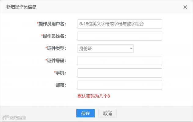 * 被创建的操作员,可使用下图中录入的用户名、默认密码登录系统。