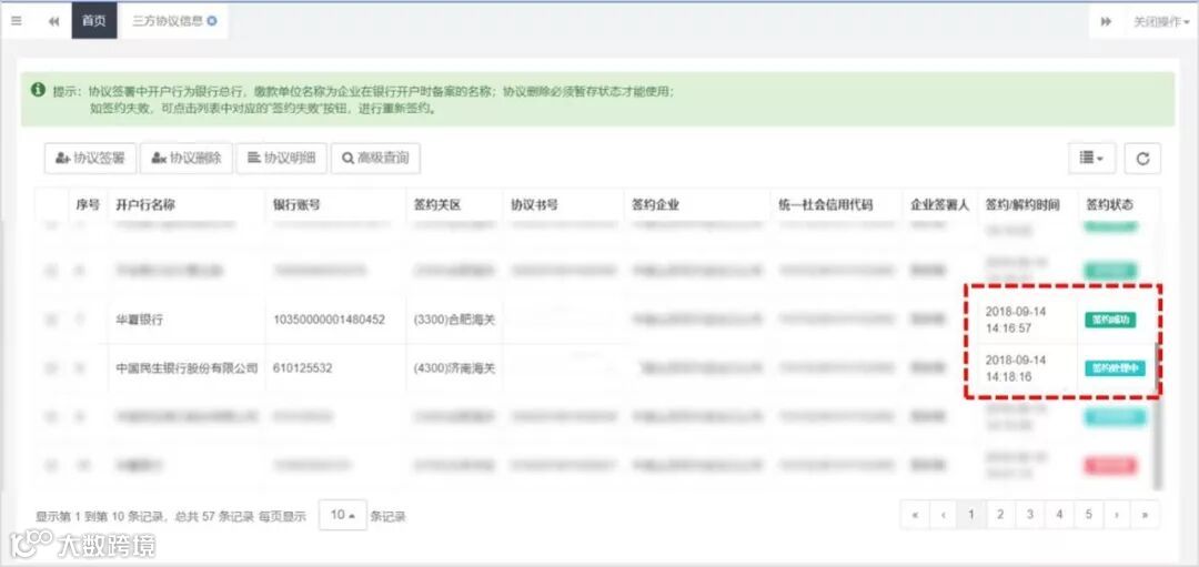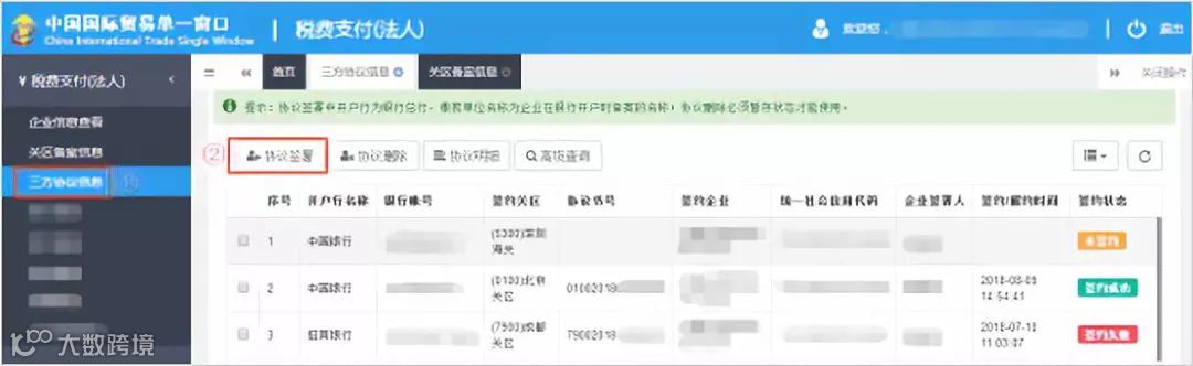 可在系统左侧菜单内选择“三方协议信息”,查找到上述签约的记录(状态为“签约处理中”),等待银行审批通过后,状态为“签约成功”(如下图)。
