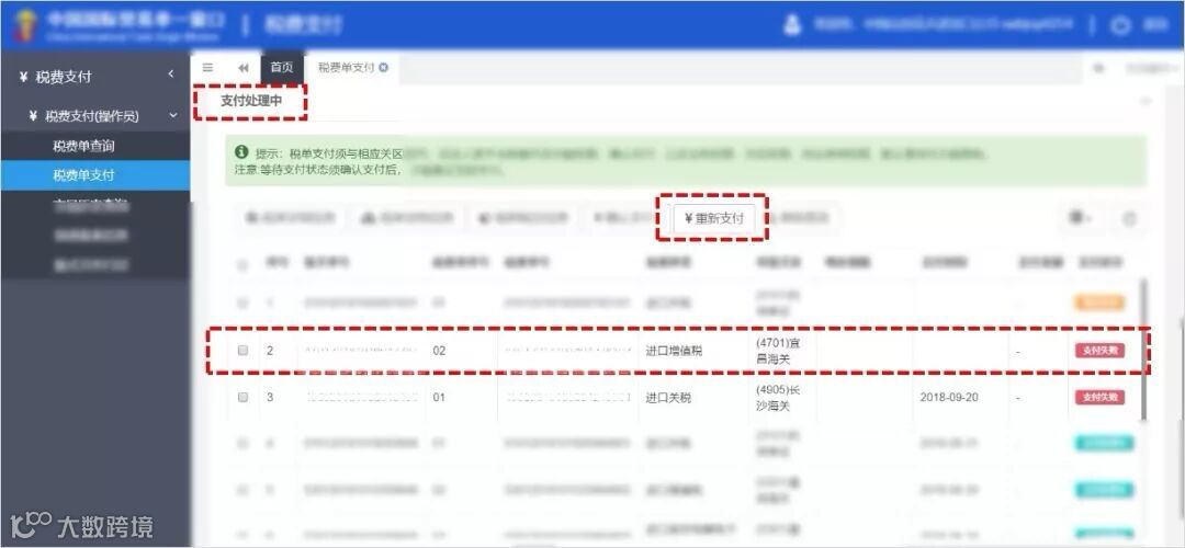 ▶查找状态为“支付失败”的税单。勾选后,点击
