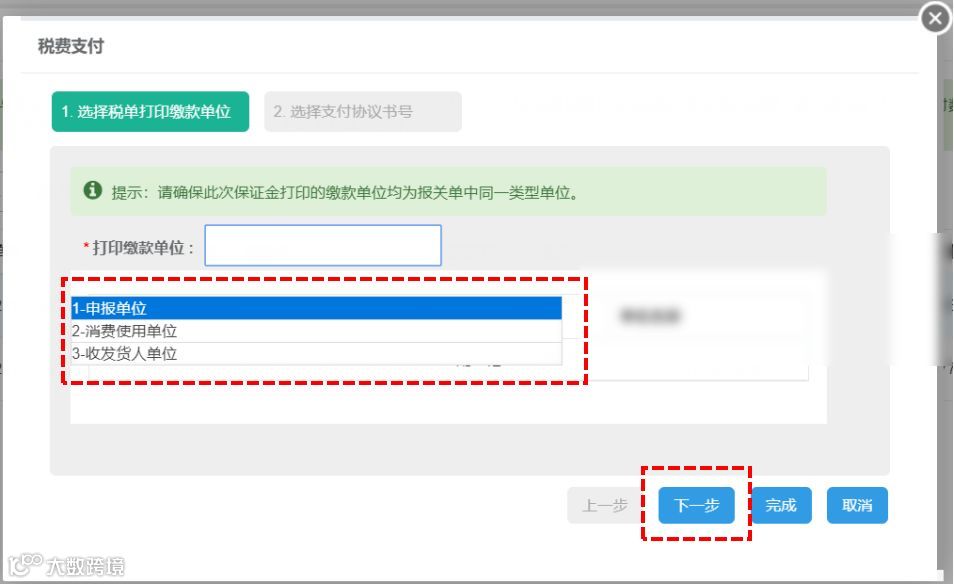 提示:下拉菜单中显示的“1-申报单位、2-消费使用单位、3-收发货人”,是该票报关单内的三家单位。此处选择的打印缴款单位,就是版式文件(又称缴款书)打印出来的缴款单位名称 !