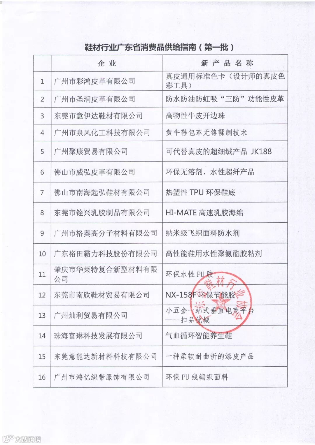 经过宣传发动、企业申报、专家审核及行业公示,认定广州、东莞、佛山、肇庆等地16家企业的16项新产品新技术,入选第一批广东消费品供给指南(鞋材行业)。其中,新产品14项,新技术1项,平台建设1项。涉及皮革人造革有7项, 胶粘剂有3项,鞋底、鞋垫、鞋化有3项,其余有2项。属于绿色环保方向的有7项,属于节能降效或降低成本的有3项,属于填补空白或提高性能的有5项,属于平台建设1项,属于改善特殊人群供给1项。