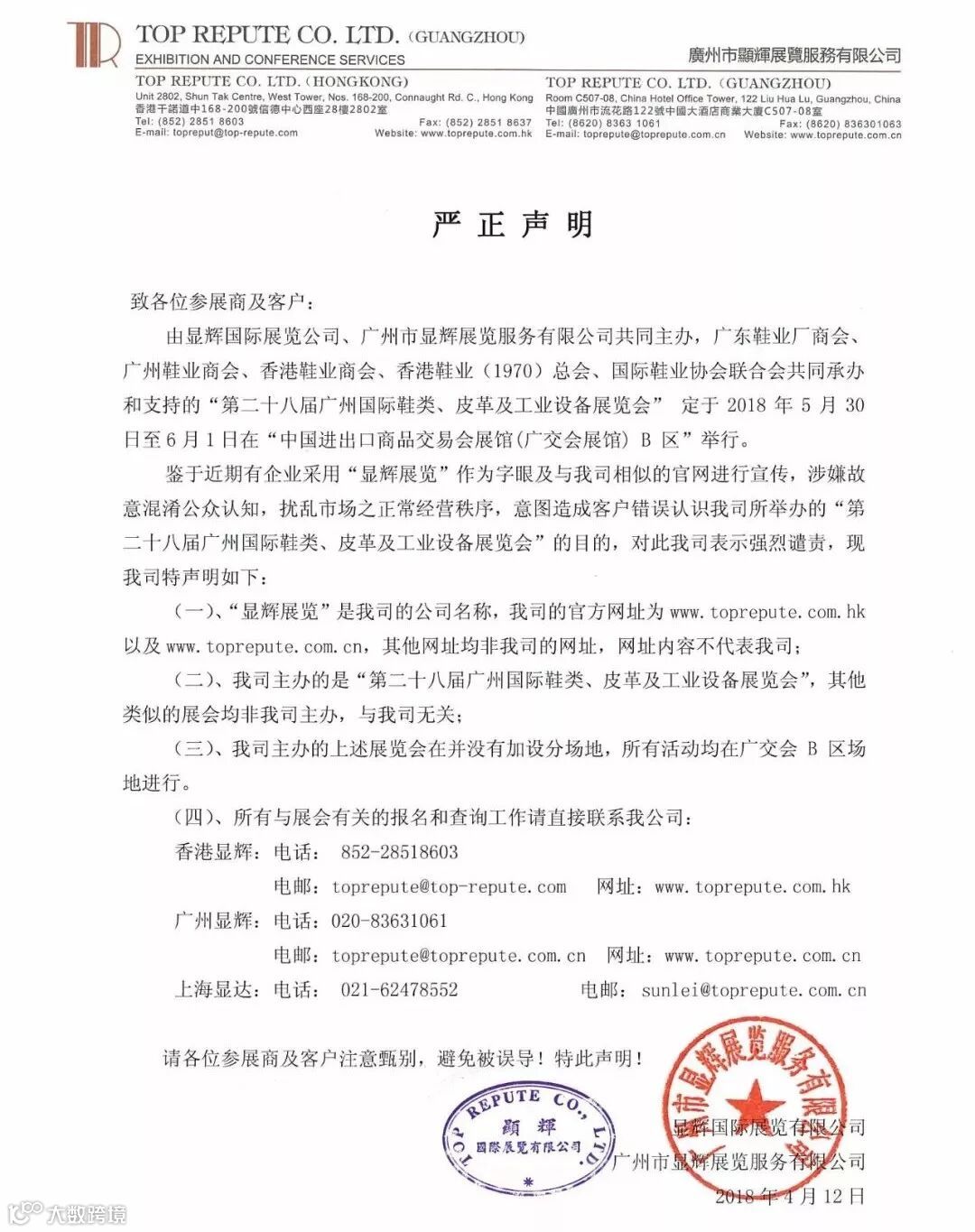 【特别关注】关于冒用“显辉展览”名义的严正声明 广东省鞋材行业协会