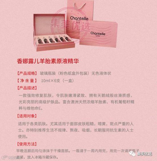 Chantelle香粉羊胎素,是一款可以用来长期养肤的精华原液。️0铅️0汞️0激素添加,纯天然羊胎素、葡萄籽提取物、小分子胶原蛋白肽、VE等成分,孕妇哺乳期完全可以使用。