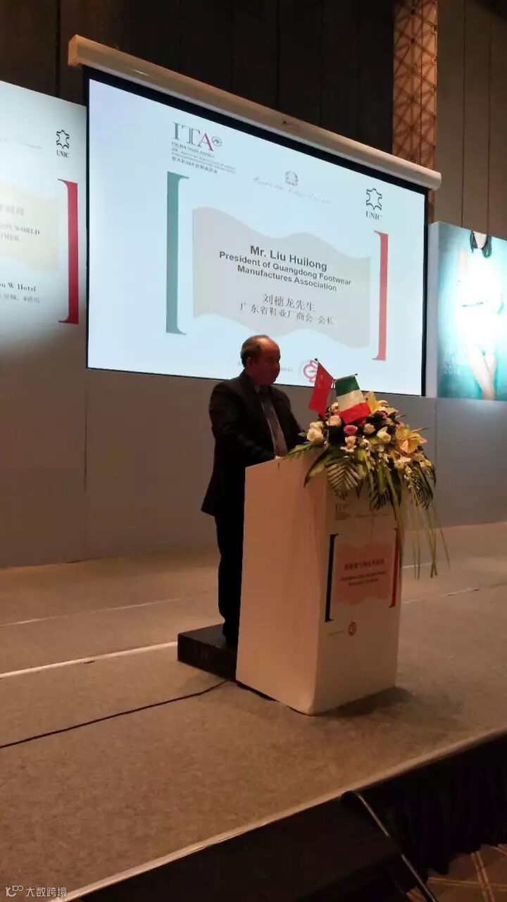 刘穗龙会长在致辞中讲到“中国作为后起之秀,经过30多年的发展,已经成为全球最大的皮革生产国家,各类皮革产品均居全球首位。我们所在的广东,是我国皮革产品的生产大省和出口大省。其中,皮鞋产量居全国第二位,皮具箱包产量居全国首位,制革也排名前列。而广东鞋类皮革行业的一大特点是,高品质、引领国内潮流。在中国,潮流和品质已经成为广东鞋、包、皮革的代名词,这一点与意大利皮革产业在全球的地位类似。毫无疑问,广州已成为中国鞋、包、皮革的时尚之都,潮流之都。”