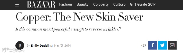 而且早在2014年,全球最具权威的女性时尚杂志之一,时尚芭莎就采访了纽约Mount Sinai医院皮肤科,化妆品和临床医学研究主任 Joshua Zeichner医生,证实了铜元素对皮肤的保养作用。
