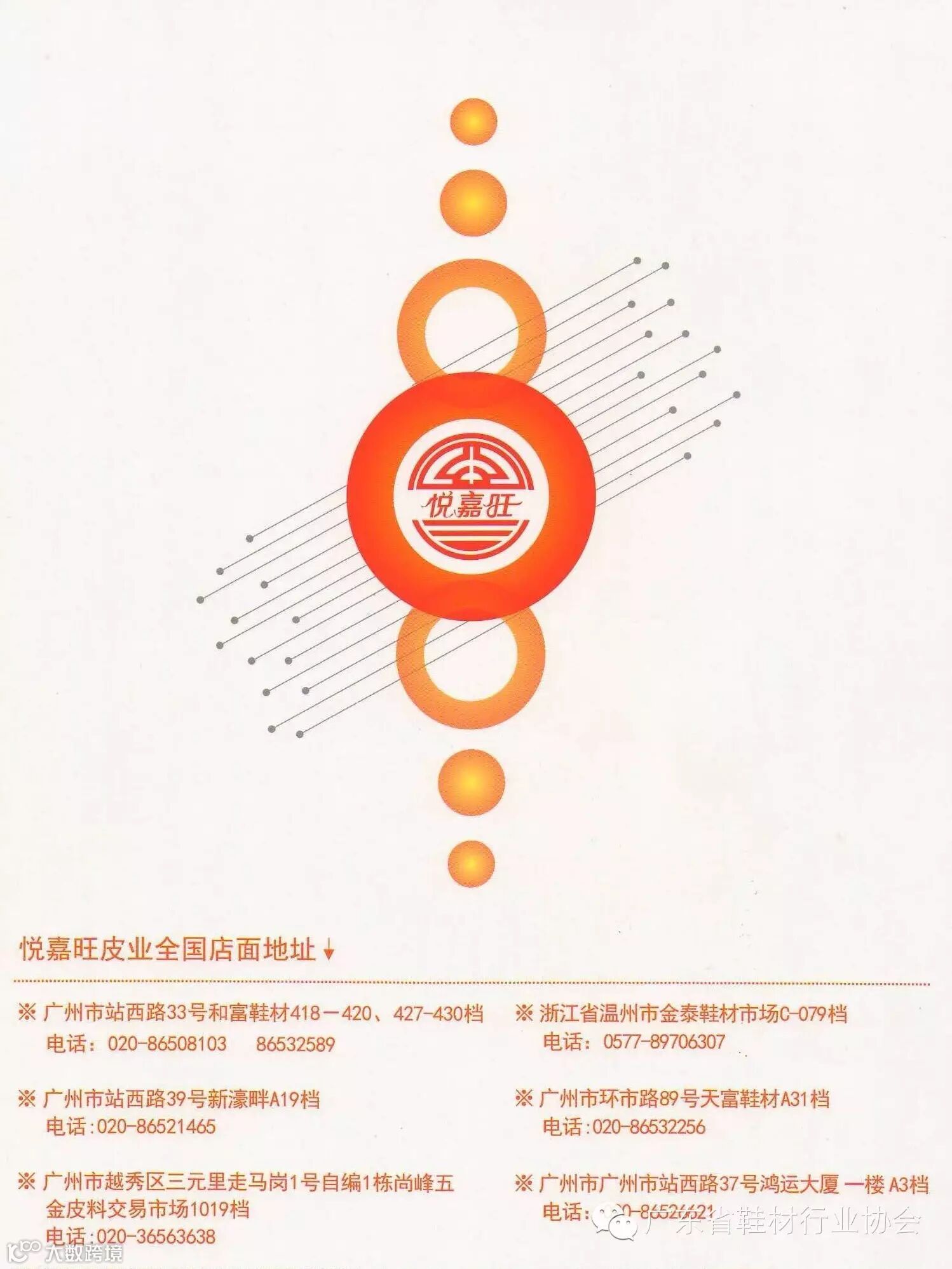 悦嘉旺皮业成立于1983年,位于广东省广州市荔湾区站西路33号和富大厦4楼。是一家以经营纳帕皮,摔纹皮,水染皮,半水染皮,小牛皮等,头层牛皮为主的公司。经过多年的辛勤开拓,现已拥有6间商铺分别位于广州市站西路39号新濠畔A19档,广州市站西路39号新濠畔B58档,广州市环市西路89号天富鞋材A31档,广州市越秀区三元里走马岗尚峰皮料交易市场1019档,天津市南开区广开大街底商10号,浙江省温州市金泰鞋材市场C-079档。