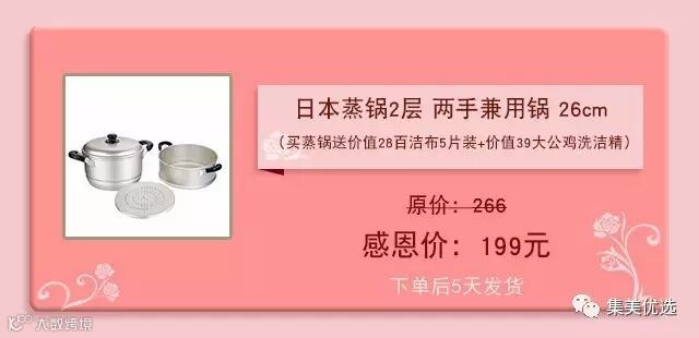 买蒸锅送价值28元百洁布5片装+价值39元大公鸡洗洁精