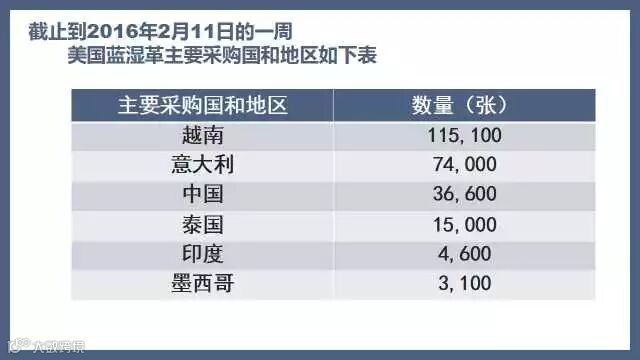 截止到2016年2月11那一周里,美国二层蓝湿革净销量为2,405,600磅,比上周的 213,600磅有大幅上扬,其中中国采购量为443,500磅,韩国采购量 423,500磅,越南采购量41,400磅。