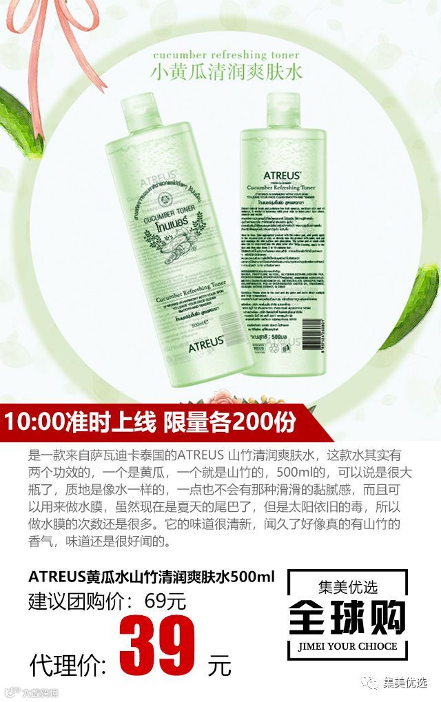 泰国Atreus最新出品的一款爆红产品。淡淡的黄瓜,味道特别清新,早上用来的时候可以唤醒一天的精神。这款爽肤水能够温和亲合肌肤,同时长效保持肌肤洁净干爽,皆因它整个产品全线采用的是纯天然原料制作而成,护肤理念是彻底赶走油腻,将干爽护肤洁净到底,不含酒精,成分的甜菜碱很好的降低皮肤刺激性。