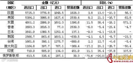 三、对欧盟、美国、东盟出口增长,对日本出口下降;进口方面均为下降。前2个月,欧盟为我国第一大贸易伙伴,中欧双边贸易总值5725亿元,增长 3.8%,占我外贸总值的15.1%。其中,我对欧盟出口3777亿元,增长13%;自欧盟进口1948亿元,下降10.3%;对欧贸易顺差1829亿元,扩大56.3%。美国为我国第二大贸易伙伴,中美双边贸易总值为5394亿元,增长8.2%,占我外贸总值的14.2%。其中,我对美国出口3967 亿元,增长21.2%;自美国进口1427亿元,下降16.7%;对美贸易顺差2540亿元,扩大62.8%。 前2个月,东盟为我国第三大贸易伙伴,与东盟双边贸易总值为4601亿元,增长11.5%,占我外贸总值的12.1%。其中,我对东盟出口2999亿元,增长38.4%;自东盟进口 1602亿元,下降18.2%;对东盟贸易顺差1397亿元,扩大5.7倍。日本为我国第五大贸易伙伴,中日双边贸易总值为2642亿元,下降9%,占我外贸总值的7%。其中,对日本出口1390亿元,下降4.1%;自日本进口1252亿元,下降13.8%;对日贸易顺差138亿元,去年同期贸易逆差 4.1亿元。 前2个月,内港双边贸易总值为2693亿元,下降6%,占内地外贸总值的7.1%。其中,对港出口2616亿元,下降5.4%;自港进口77亿元,下降23.4%;对港贸易顺差2539亿元,收窄4.7%(表1).