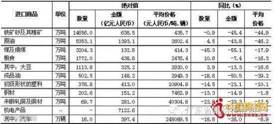 六、铁矿砂、煤、成品油等主要大宗商品进口量减少,原油、粮食进口量增加,主要进口商品价格普遍下跌。前2个月,我国进口铁矿砂 1.47亿吨,减少0.9%,进口均价为每吨435.7元,下跌44.9%;原油5353万吨,增加4.5%,进口均价为每吨2602元,下跌 46.2%;煤3204万吨,减少45.3%,进口均价为每吨414.3元,下跌17.9%;成品油502.5万吨,减少18.6%,进口均价为每吨 2949元,下跌39.2%;初级形状的塑料378.8万吨,减少14.5%,进口均价为每吨1.09万元,下跌10.1%;钢材202.6万吨,减少 13.3%,进口均价为每吨7463元,下跌1.8%;未锻轧铜及铜材69.7万吨,减少23.8%,进口均价为每吨4.03万元,下跌12.5%。 此外,进口粮食1772万吨,增加10.6%;其中大豆1114万吨,增加3.9%,进口均价为每吨2920元,下跌16.6%。机电产品进口7123亿元,下降2.7%;其中汽车16万辆,减少18.8%(表3).