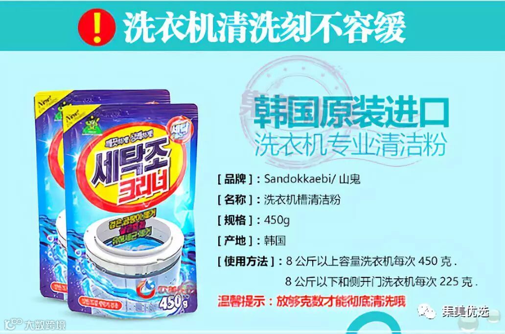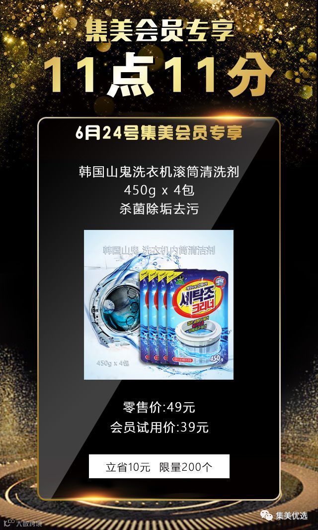 6月24日,11:11,韩国山鬼洗衣机滚筒清洗剂450g x 4包 杀菌除垢去污 ,原价49元,活动秒杀价39元,限量200份,手慢无!!!