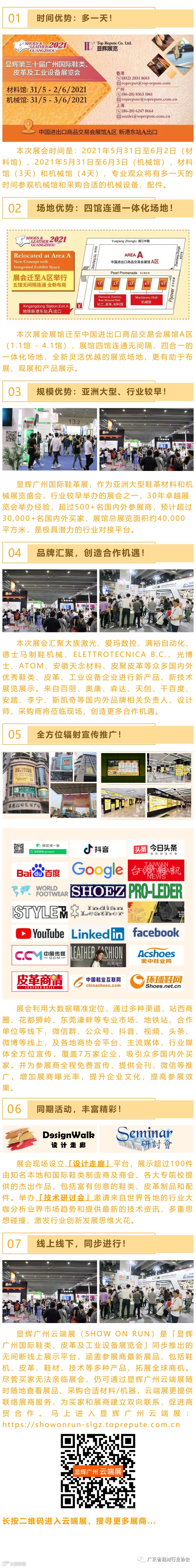 「显辉广州国际鞋类、皮革及工业设备展览会」是全球鞋业其中一个重要的国际鞋类和皮革展览会,预计会吸引超过400+名参展商来自10+个国家和地区;25,000名专业买家来自40+个国家和地区汇聚在约40,000平方米的展馆无间隔相连、五合一展览场地。展品涵盖整个行业生产链,展示各种机械和材料,包括智能制鞋/制革机械、缝纫机、自动化工业技术、皮革、配件、辅料和化工等等。