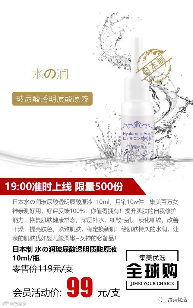 肌肤一旦缺水,会导致干燥、暗哑、松弛、出现皱纹等多种皮肤问题。今天要推荐给你来自集美优选日本定制研发的日本制 Sample玻尿酸透明质酸原液 10ml/瓶。它能直达肌肤真皮层,瞬间补水、淡化皱纹、缩小毛孔,让皮肤恢复水润和弹性,从根本上解决皮肤问题。