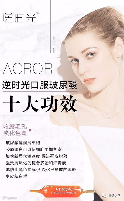 逆时光口服玻尿酸具有以下十大功效1深层补水、晶莹弹润,2美白紧致、柔嫩肌肤,3修复重生、对抗疤痕,4祛黑眼圈、消除眼袋,5抗皱去纹、延缓衰老,6收缩毛孔、淡化黑斑,7软化指甲、滋养甲面,8锁定钙质、强健骨骼,9丰胸提臀、健美乳房,10强韧发丝、柔亮发丝
