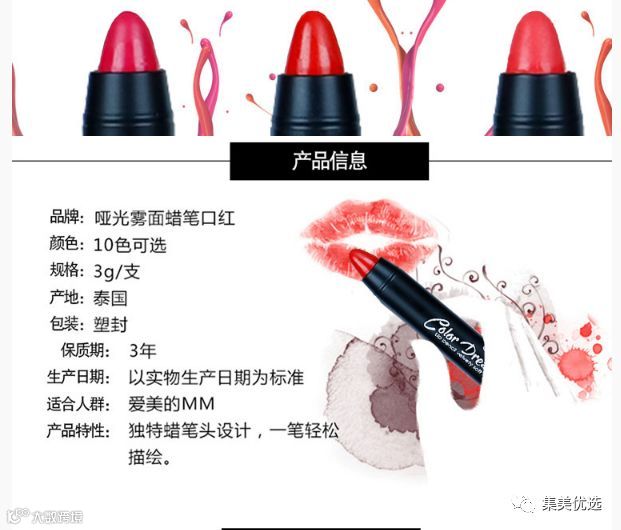 泰国OZISA欧迪比欧odbo蜡笔口,这两年非常火,因为它集口红+唇线笔+唇膏于一身,可以说是相当疼人的一支唇膏了。超级适合夏天!持久保湿不易脱色哑光雾面,显白,多色可选,黄皮白皮都可以驾驭!雾面的质感上唇非常有个性,上色非常饱满,虽是哑光质地但采用了摩洛哥坚果油配方,涂在嘴上非常保湿,滋润度分分钟俘获你的芳心!,超级少女提气色!笔芯!关键是才二十几块钱!买不了吃亏!买不了上当!!