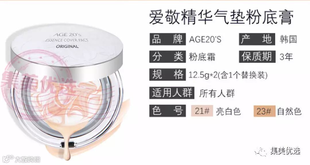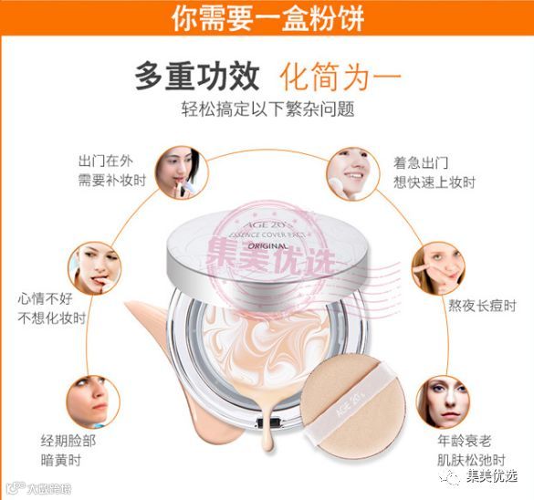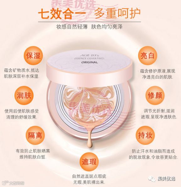 敬AGE 20'S遮瑕保湿水珠精华粉底霜●防晒 ●长效保湿 ●遮瑕 ●美白,韩国AGE 20s精华粉饼霜,是目前韩国非常流行的底妆,10万余个好评堪称底妆界的"怪物"!这款精华粉底霜含有68%浓缩精华,涂在脸上是湿润的感觉,皮肤从内到外保持湿润,也不易出油哦,拥有超强的遮瑕力,却呈现自然裸妆效果,含有提亮因子,使用后提升整个人的气色,秒杀所有底妆的水粉霜,白色"奶泡"部分含有4种天然(红宝石,珍珠,白宝石,钻石)粉末,让妆容更添通透光泽感~让肌肤一整天光滑洁净不泛油光专利遮瑕成分+专利油脂吸附成分,具备美白,改善皱纹,隔离紫外线三种功能,轻松打造精致裸装~