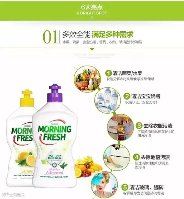 Morning fresh洗洁精能洗去最艰难的油脂!其有效成分高,即时是最困难的清洁餐具、壶、锅也能轻松搞定。让它们干净,光泽!还能清洁蔬果,天然提取物,洗碗的同时可以保护双手,用完后双手完全不会感觉毛躁粗燥;有抗菌和抑制异味的作用,可去除强硬油脂, 浓缩配方,每次使用很少的分量即可。包装是生物降解的;无磷酸。