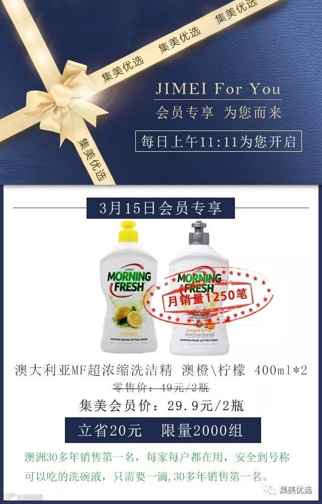 3月14日,11:11,在集美会员专享,只需要29.8元就可以买到正品澳洲原装进口的Morning fresh洗洁精2瓶(原味香型),立省29.8元,限量2000组,手慢无!!!