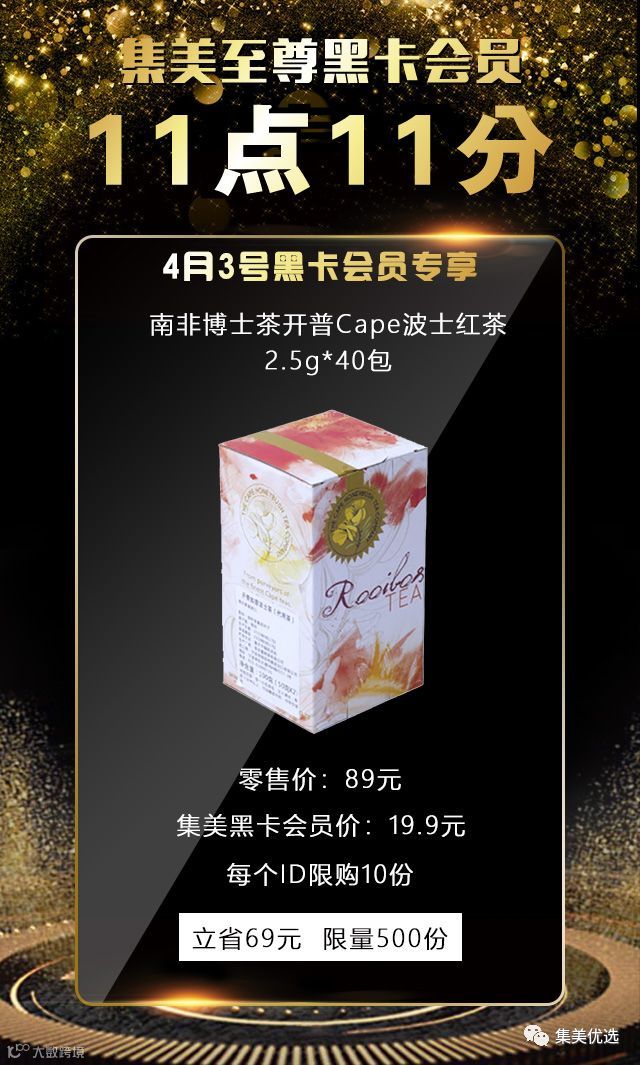 4月3日,11:11,在集美会员专享,只需要19.9元就可以买到正品南非博士茶国宝茶开普Cape波士红茶2.5g*40包无咖啡因,立省69元,限量500份,手慢无!!!