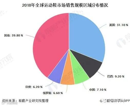 2018年,在全球运动鞋市场销售规模中,美国所占的额分最大,达31.1%,主要原因是全球运动鞋服品牌巨头大多出自美国地区;其次是巴西及中国,所占的全球运动鞋市场份额分别为9.2%、7.1%。