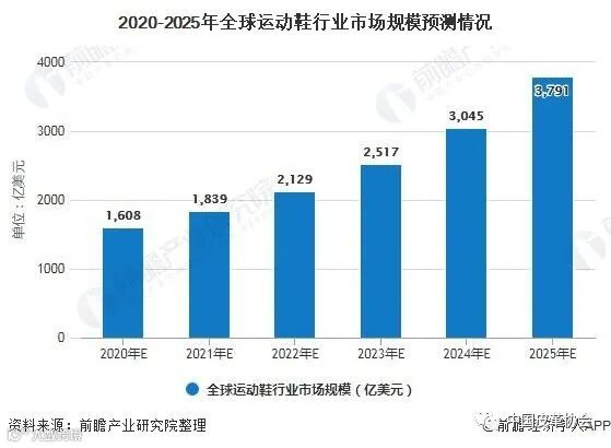 随着世界经济持续复苏,全球经济总体向好,特别是印度、中国等新兴发展中国家,任保持着中高速的经济增长且庞大的人口规模,消费市场潜力巨大。前瞻预测,由于受此次新冠病毒的影响,2020年全年运动鞋需求量将发生下降,全球运动鞋市场需求将保持中速稳定增长,到2025年,全球运动鞋市场规模将达到3791亿美元左右。
