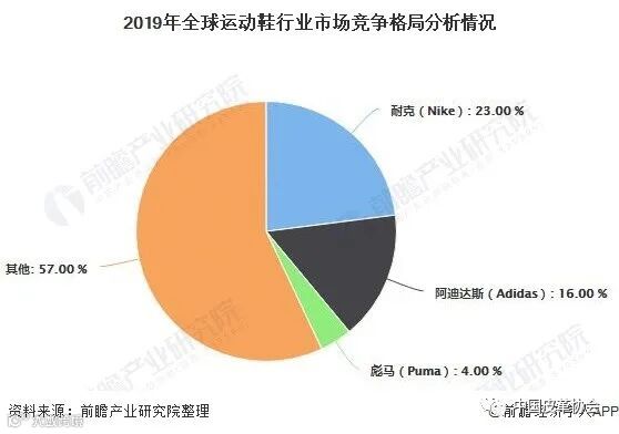 2019年,全球运动鞋市场中,耐克和阿迪达斯两个品牌的运动鞋营收规模占全球比重居前列,分别为23%和16%,彪马运动鞋营收规模占全球的4%。中国运动鞋品牌安踏、李宁等在全球运动鞋市场中所占份额均在2.5%以下,市场竞争十分激烈。