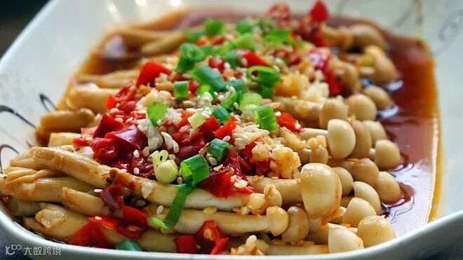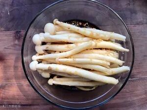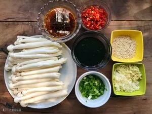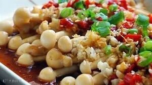 食材:海鲜菇、剁椒、蒜末、秘制辣油(辣椒油)、姜末、生抽、蚝油、葱花、芝麻