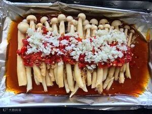 4.烤盘铺锡纸四周折起,防止汤汁流动,摆上腌制好的海鲜菇依次倒入剁椒,蒜末,秘制辣椒油