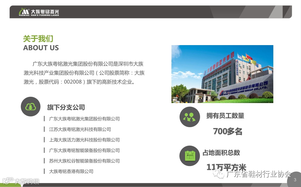 广东大族粤铭激光集团股份有限公司是深圳市大族激光科技产业集团股份有限公司(公司股票简称:大族激光,股票代码:002008)旗下的高新技术企业。拥有员工数量700多名,占地面积总数11万平方米。公司专注于工业激光设备制造20年,产品畅销全球 100 多个国家,是中国成立最早的、实力最强的著名工业激光装备制造商之一。