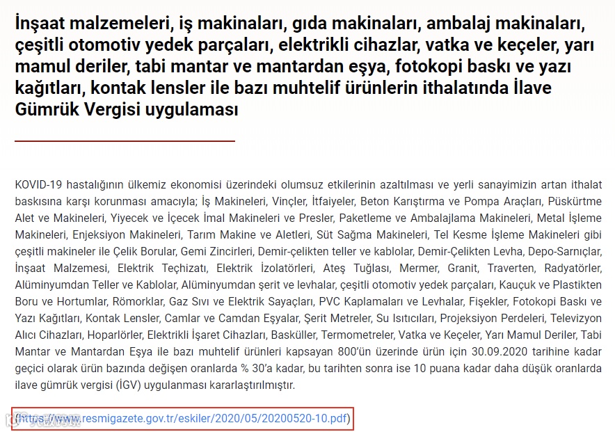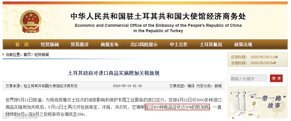 为降低疫情对土耳其经济的消极影响和保护本国工业面临的进口压力,在继4月21日对3000多种进口商品实施附加关税后,5月11日又对包括珠宝、冰箱、洗衣机、空调等超过400种商品征收达30%的附加税。