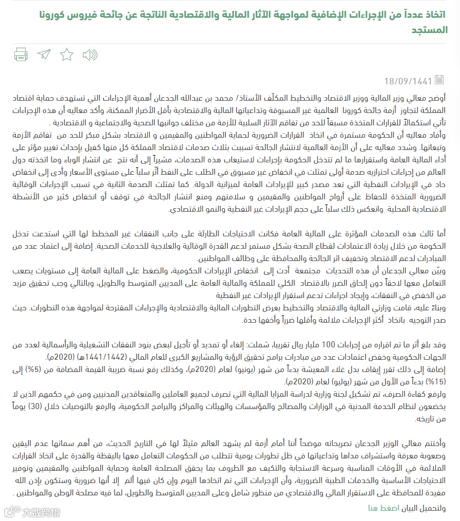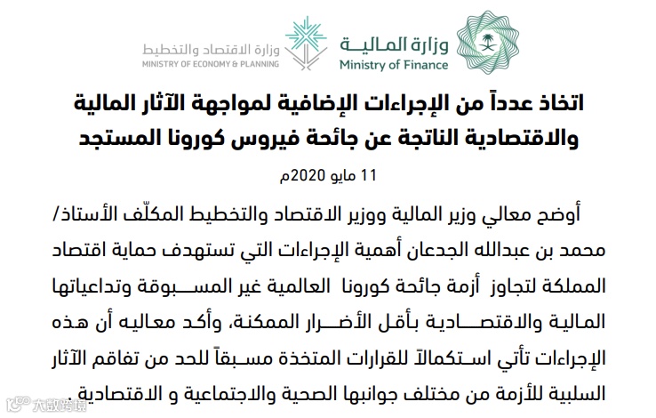 沙特财政部近日发文,为保护沙特阿拉伯经济以克服史无前例的全球性疫情及其对金融和经济造成的损失,政府作出必要的决定,尽早保护公民,居民和经济,以减轻危机的加剧及其后果。