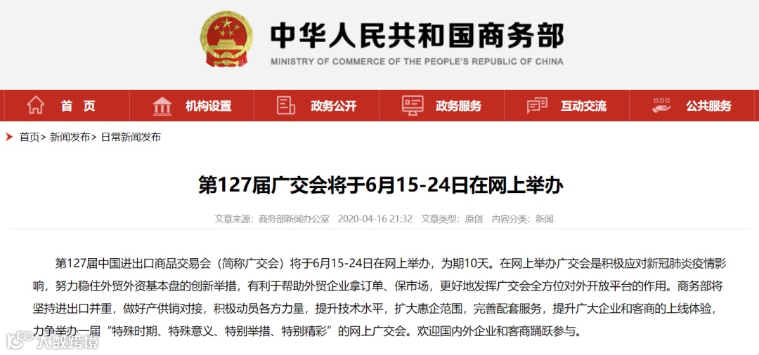 第127届中国进出口商品交易会(简称广交会)将于6月15-24日在网上举办,为期10天。在网上举办广交会是积极应对新冠肺炎疫情影响,努力稳住外贸外资基本盘的创新举措,有利于帮助外贸企业拿订单、保市场,更好地发挥广交会全方位对外开放平台的作用。商务部将坚持进出口并重,做好产供销对接,积极动员各方力量,提升技术水平,扩大惠企范围,完善配套服务,提升广大企业和客商的上线体验,力争举办一届“特殊时期、特殊意义、特别举措、特别精彩”的网上广交会。欢迎国内外企业和客商踊跃参与。