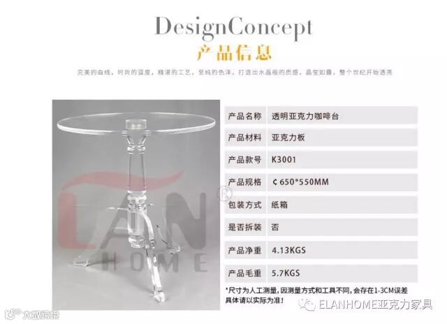 1.品名:亚克力咖啡台/亚克力小圆台/边几/多功能台;2.材质:进口亚克力;3.产品规格:500*500*530MM;4.起订量:透明1张起订, 颜色200张起订;5.结构:拆装;6.包装:1张/箱, 外箱规格:56.5*65.6*11.5CM, 0.043CMB,7.净重4.6KGS, 毛重5.7KGS; 8.装柜数量:1650PCS/40HQ;