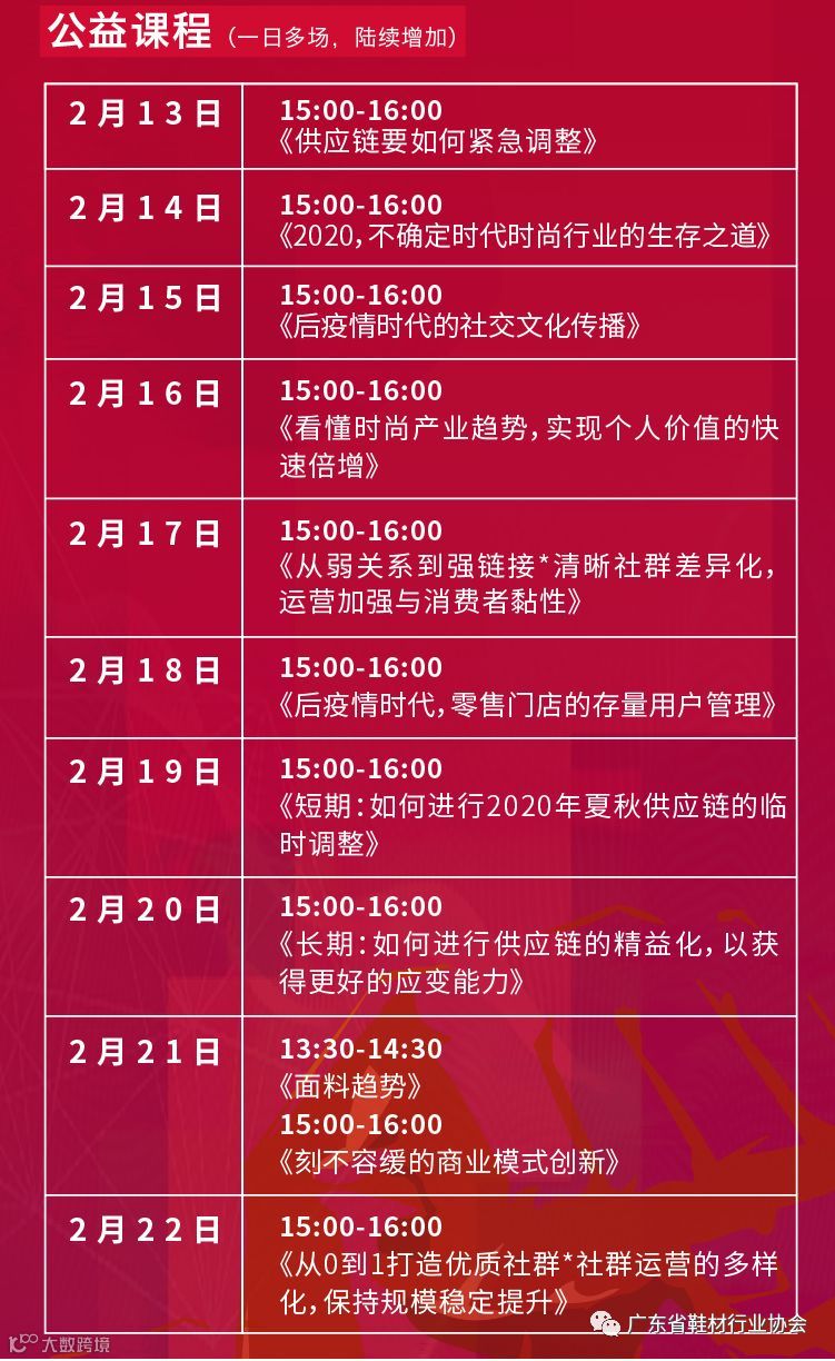 为此我们广东省鞋材行业协会特与逸尚创展(POP趋势、设界、时创教育、优料宝)继续持续公益服务产业发展,帮助企业远程渡过难关,同时号召联合发起了更多时尚产业基地平台商协会组织、行业导师专家一起加入进来,持续推动此次公益项目;
