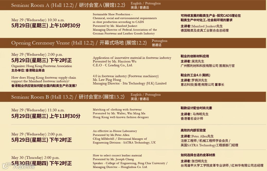 为了更好地推动中国鞋业的发展,显辉展还邀请来自本地和国际知名专业讲师举行多场研讨会,分享关于现在、未来鞋革业的机遇和挑战。让业界人士了解的最新国际行业技术及潮流走向,发掘潜在商机。