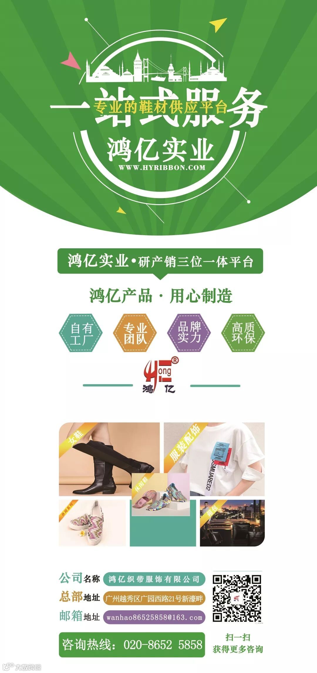 广州鸿亿织带服饰有限公司,是集研发、生产、销售于一体的鞋材辅料专业提供商, 主要包含鞋材辅料、成品鞋、半成品鞋、服装配饰、加盟连锁、产业投资、产品研发等业务板块。