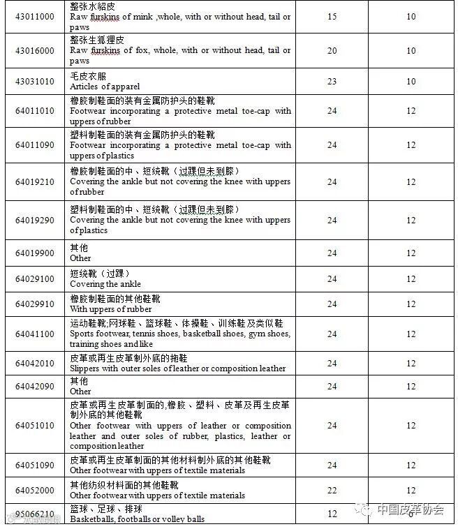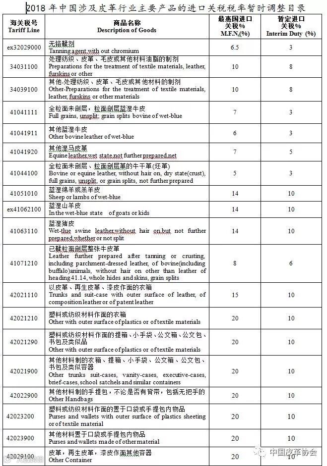 2018年有3个皮化产品海关税号、7个半成品革海关税号、1个成品革海关税号、8个箱包海关税号、2个生毛皮海关税号、1个毛皮服装海关税号、13个鞋类海关税号和1个球类海关税号暂时下调。