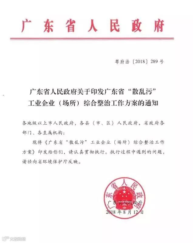 广东省环境保护厅5月7日印发《广东省打赢蓝天保卫战2018年工作方案》;6月19日,全省生态环境保护大会暨污染防治攻坚战工作推进会在广州召开。会后,省委办公厅、省政府办公厅印发《广东省打好污染防治攻坚战三年行动计划(2018-2020年)》;8月12日,广东省人民政府印发广东省“散乱污”工业企业(场所)综合整治工作方案。自此,全省性的工业污染治理强力推进。
