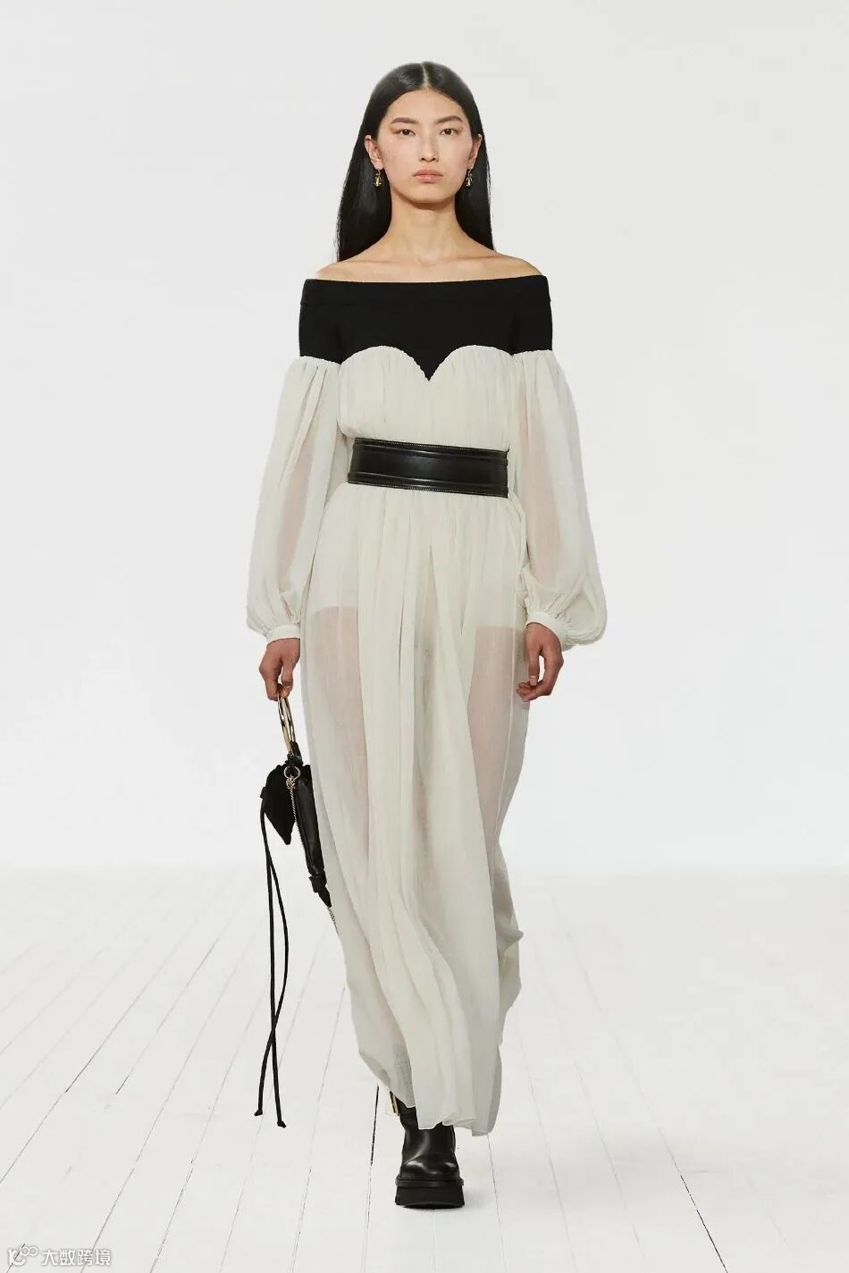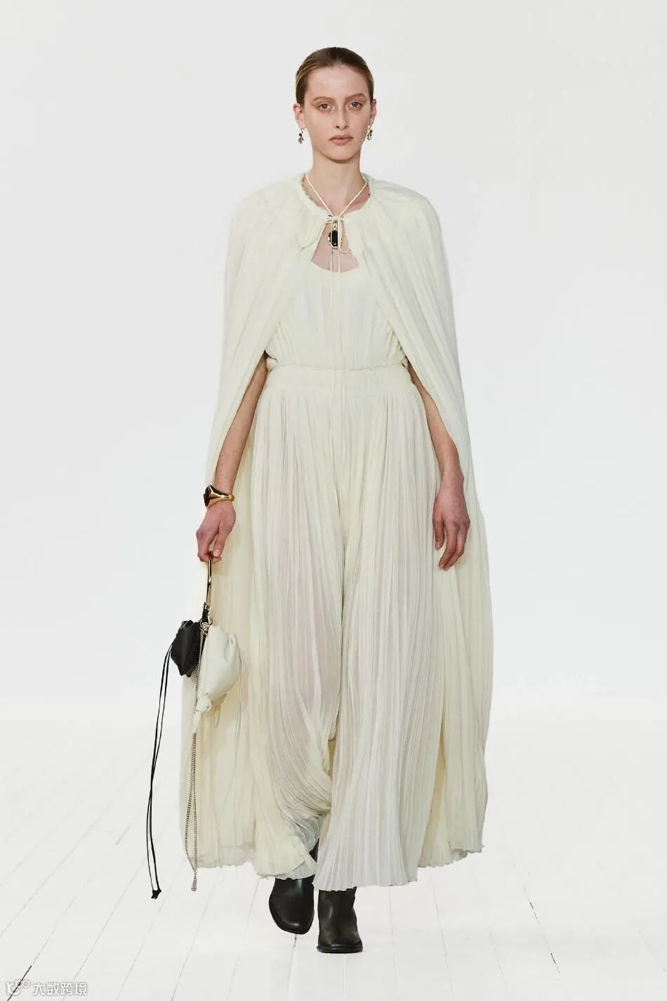 Chloé 2023秋冬大秀在蓬皮杜艺术中心举办,设计总监 Gabriel Hearst 从意大利著名巴洛克风格女画家Artemisia Gentileschi 的画作中汲取灵感,强调女性作为领导者的强大力量。简洁的剪裁与柔和自然的颜色,让本季羊羔绒和皮草作品在温暖舒适的同时视觉上也更加轻盈不沉闷。圆肩衣、羊腿袖展现着古朴典雅的浪漫之美。拼色设计也为本季带来灵动跳跃的美感。