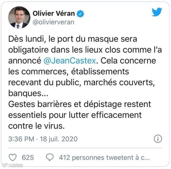 法国卫生部长当地时间7月18日表示,将从7月20日起在所有室内公共场所强制佩戴口罩,其中主要包括商店、公共接待场所、室内市场以及银行等。