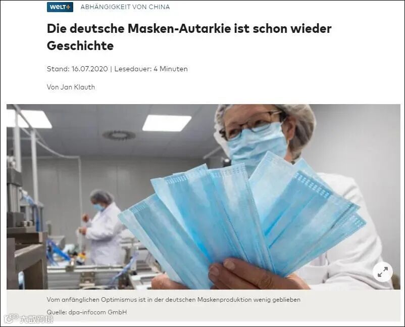 今年4月,德国500多家公司迅速转型生产口罩,但因生产标准与质量、利润低等原因,许多公司的短期转型已宣布“破产”。德国口罩“自给自足运动”也以失败告终,并仍高度依赖中国。据报道,德国已采购了7亿只口罩,大部分由“中国制造”。德国近来又向中国进口数亿只口罩。
